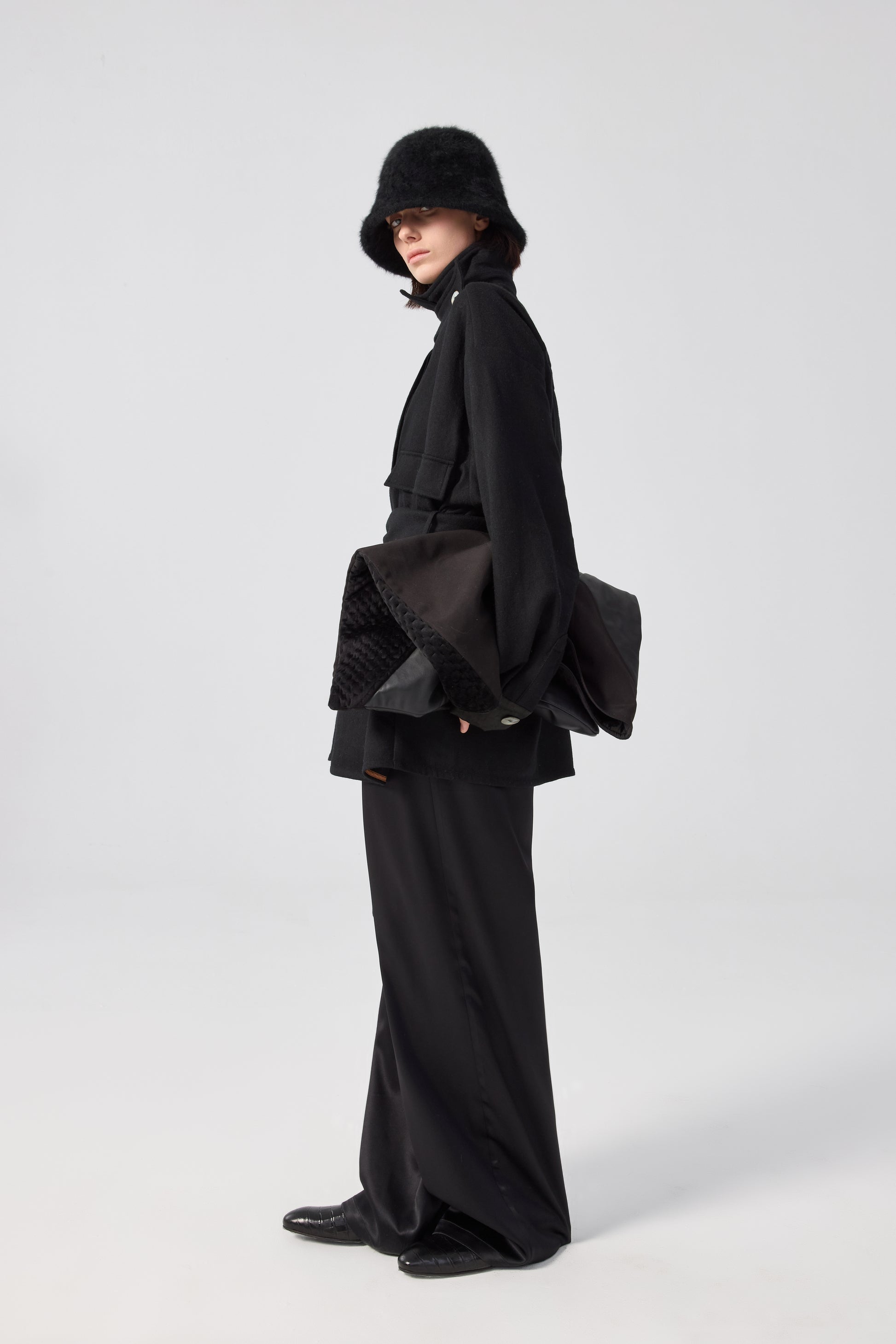 A structured black wool shirt with a clean, elongated silhouette and quiet sculptural volume. Tea-silk trimmed cuffs introduce a tactile contrast, while natural shell buttons bring a discreet luminous accent to the minimal design. The belted waist refines the shape without losing ease, and the smooth drape with minimal detailing creates a composed, contemporary presence.